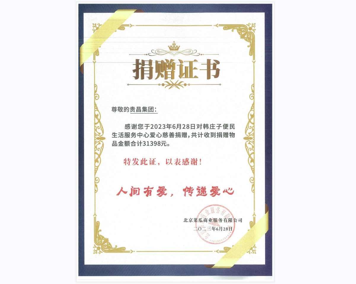 貢獻(xiàn)“兩新”企業(yè)在社會(huì)事業(yè)中責(zé)任愛心慈善,捐助韓莊子便民生活服務(wù)中心物資313983.00元;