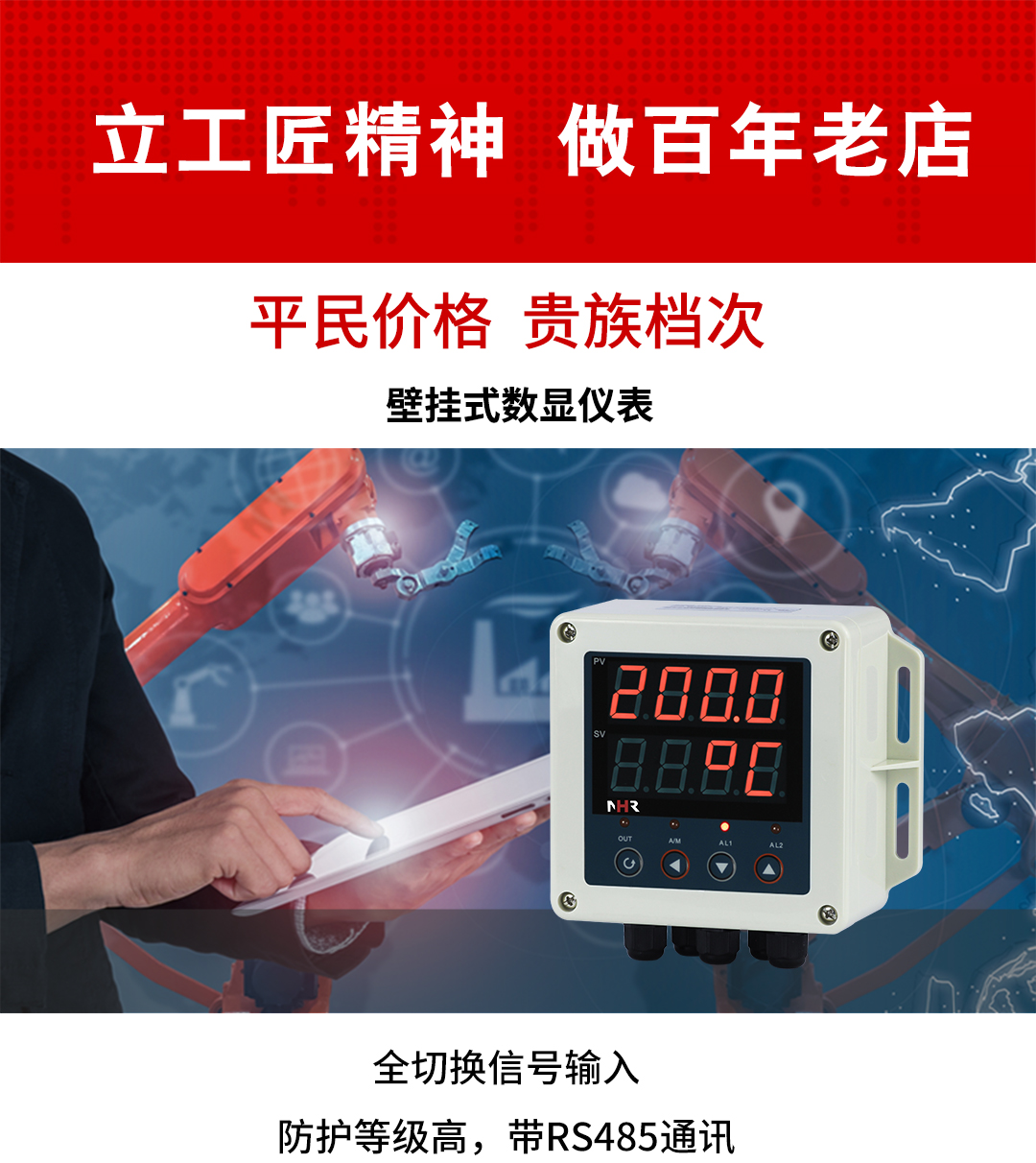 虹潤公司是專業(yè)生產(chǎn)數(shù)顯表的國家專精特新“小巨人”企業(yè),生產(chǎn)的壁掛式數(shù)顯儀表,具有全切換信號輸入,高抗干擾,IP65防護等級,全隔離設(shè)計,變送輸出或RS485通訊等特點。產(chǎn)品獲得巡回檢測顯示方法及裝置、工業(yè)模塊的導(dǎo)軌式安裝結(jié)構(gòu)等2項國家發(fā)明專利,主持起草工業(yè)過程控制系統(tǒng)用模擬輸入兩位或多位輸出儀表、物聯(lián)網(wǎng)智能溫度儀表通用技術(shù)條件等2項國家標(biāo)準(zhǔn),,以及通信系統(tǒng)多通道數(shù)據(jù)采集控制終端規(guī)范軍用標(biāo)準(zhǔn),參與國際5G標(biāo)準(zhǔn)制定,取得簡易數(shù)顯儀表等3項相關(guān)軟件著作權(quán)。產(chǎn)品廣泛應(yīng)用于電力、石化、冶金、化工、造紙、食品、輕工、制藥、熱處理、水處理、機械配套等各種工業(yè)現(xiàn)場。