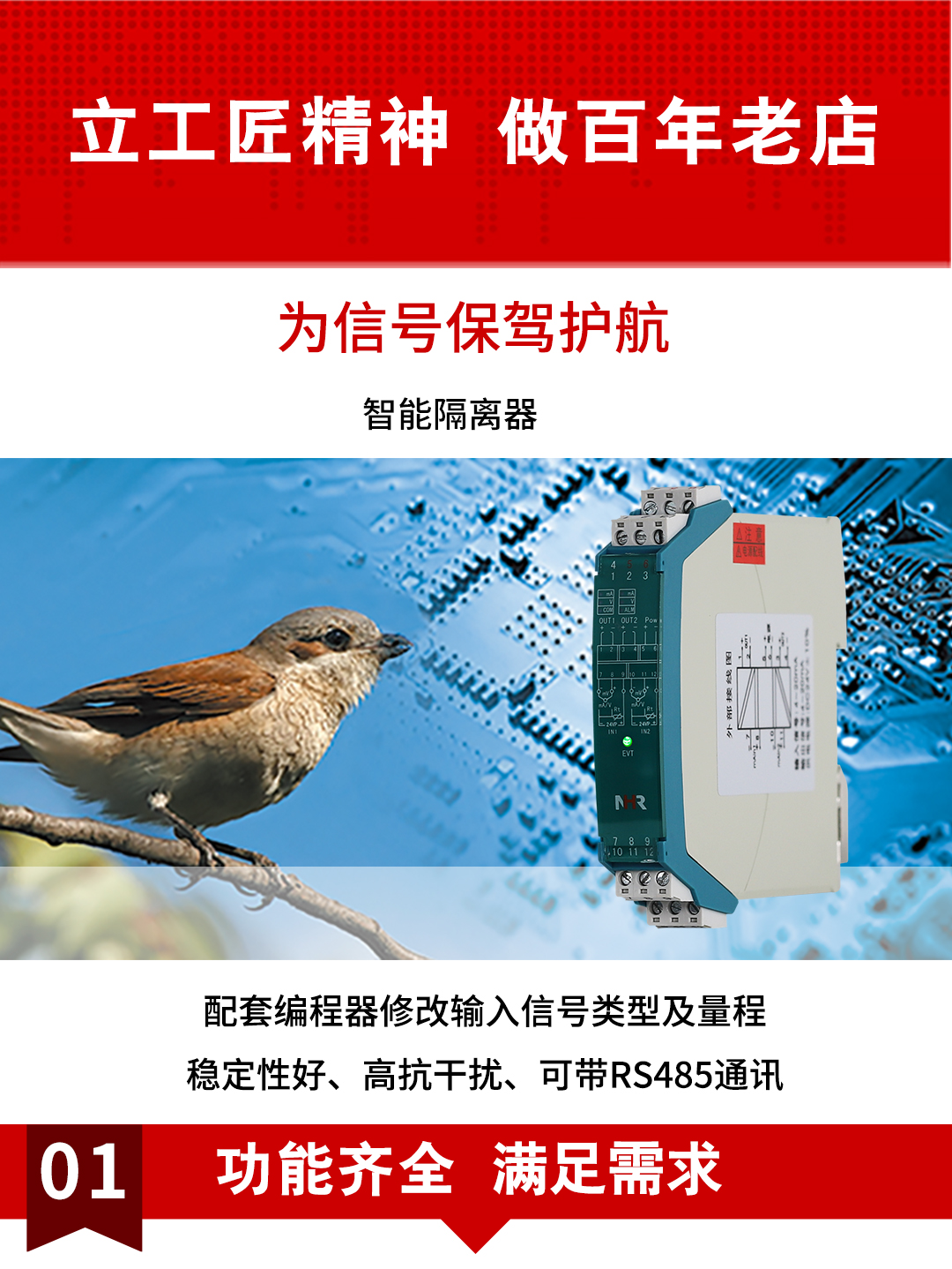虹潤公司是專業(yè)生產(chǎn)隔離器的國家專精特新“小巨人”企業(yè)。生產(chǎn)的智能信號隔離器涵蓋電流電壓變送器、溫度變送器、配電器、頻率轉(zhuǎn)換器、開關(guān)量轉(zhuǎn)換器及通訊轉(zhuǎn)換器等多種產(chǎn)品類型。產(chǎn)品獲得信號隔離器、一種二端子模塊、無源信號隔離器等3項(xiàng)國家發(fā)明專利,主持起草現(xiàn)場設(shè)備工具(FDT)接口規(guī)范、工業(yè)過程測量和控制系統(tǒng)用隔離式安全柵、工業(yè)過程測量和控制系統(tǒng)用配電器等3項(xiàng)國家標(biāo)準(zhǔn),以及通信系統(tǒng)多通道數(shù)據(jù)采集控制終端規(guī)范軍用標(biāo)準(zhǔn),參與國際5G標(biāo)準(zhǔn)制定,取得導(dǎo)軌式智能隔離器、頻率轉(zhuǎn)換器等3項(xiàng)相關(guān)軟件著作權(quán)。產(chǎn)品廣泛電力、冶金、工業(yè)電爐、變電站、高壓電機(jī)房等需要電隔離的工業(yè)自動化控制系統(tǒng)。