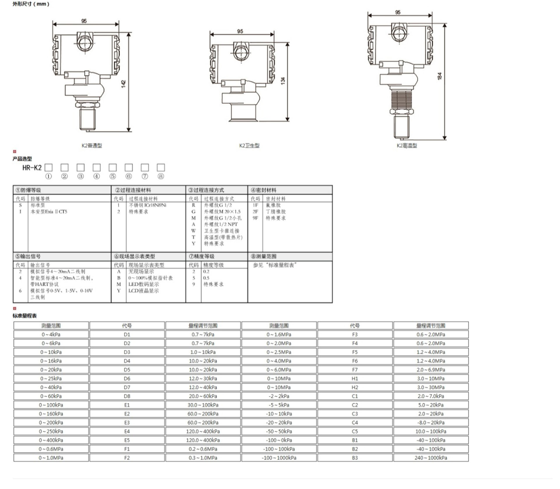 HR-K系列壓力變送器采用具有國際先進水平的擴散硅傳感器,配合高精度電子元件,經(jīng)嚴格的工藝過程裝配而成。充分發(fā)揮了傳感器的技術(shù)優(yōu)勢,使該系列壓力變送器具有優(yōu)異的技術(shù)性能。該變送器抗過載和抗沖擊能力強、溫度漂移小、穩(wěn)定性高,具有很高的測量精度。