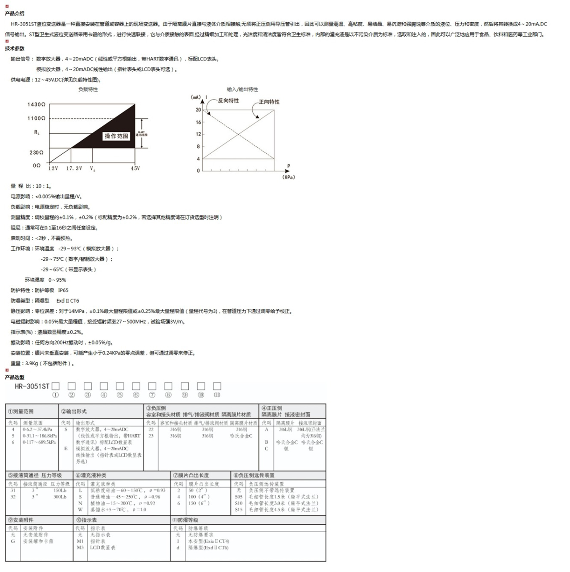 HR-3051ST液位變送器是一種直接安裝在管道或容器上的現(xiàn)場變送器。由于隔離膜片直接與液體介質(zhì)相接觸,無須將正壓側(cè)用導壓管引出,因此可以測量高溫、高粘度、易結(jié)晶、易沉淀和強腐蝕等介質(zhì)的液位、壓力和密度,然后將其轉(zhuǎn)換成4~20mA.DC信號輸出。