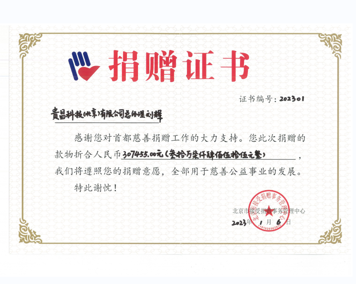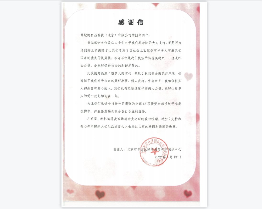慈善公益、助力夕陽,捐贈(zèng)北京市豐臺(tái)愛心敬老院物資53335.00元;