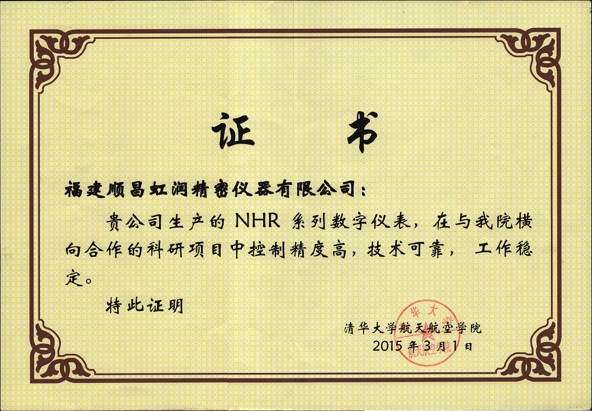 近日,由虹潤公司生產的自動化顯示控制儀表產品,成功應用于清華大學航空航天學院橫向合作科研項目,因控制精準,抗干擾性強,運行穩(wěn)定,受到了清華大學航空航天學院科研項目組的廣泛好評,并向虹潤公司頒發(fā)了證書。