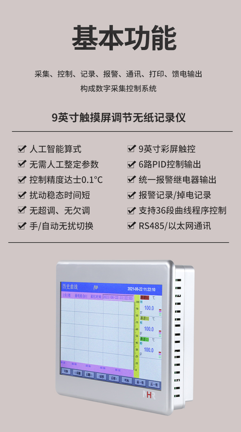 虹潤公司是專業(yè)生產(chǎn)無紙記錄儀的國家專精特新“小巨人”企業(yè)。生產(chǎn)的觸摸屏調(diào)節(jié)無紙記錄儀,具有觸摸大屏顯示,真正人工智能算式,無需人工整定參數(shù),控制精度達(dá)士0.1°C,數(shù)據(jù)記錄與轉(zhuǎn)存, RS485/以太網(wǎng)通訊,5/7/9英寸可選等特點(diǎn)。產(chǎn)品獲得智能化控制器、人工智能調(diào)節(jié)器及調(diào)節(jié)方法、模糊PID控制儀及控制方法、平板無紙記錄儀、巡回檢測顯示方法及裝置等5項(xiàng)國家發(fā)明專利,主持起草物聯(lián)網(wǎng)智能記錄儀表通用技術(shù)條件、物聯(lián)網(wǎng)智能溫度儀表通用技術(shù)條件、工業(yè)過程測量和控制系統(tǒng)用智能調(diào)節(jié)器等3項(xiàng)國家標(biāo)準(zhǔn),通信系統(tǒng)多通道數(shù)據(jù)采集控制終端規(guī)范軍用標(biāo)準(zhǔn),以及空間數(shù)據(jù)與信息數(shù)據(jù)傳輸系統(tǒng)等2項(xiàng)航天標(biāo)準(zhǔn),參與國際5G標(biāo)準(zhǔn)制定,取得觸摸屏彩色調(diào)節(jié)無紙記錄儀等3項(xiàng)相關(guān)軟件著作權(quán)。產(chǎn)品廣泛應(yīng)用于電力、石化、冶金、化工、食品、制藥、熱處理、水處理、機(jī)械配套等諸多領(lǐng)域。
