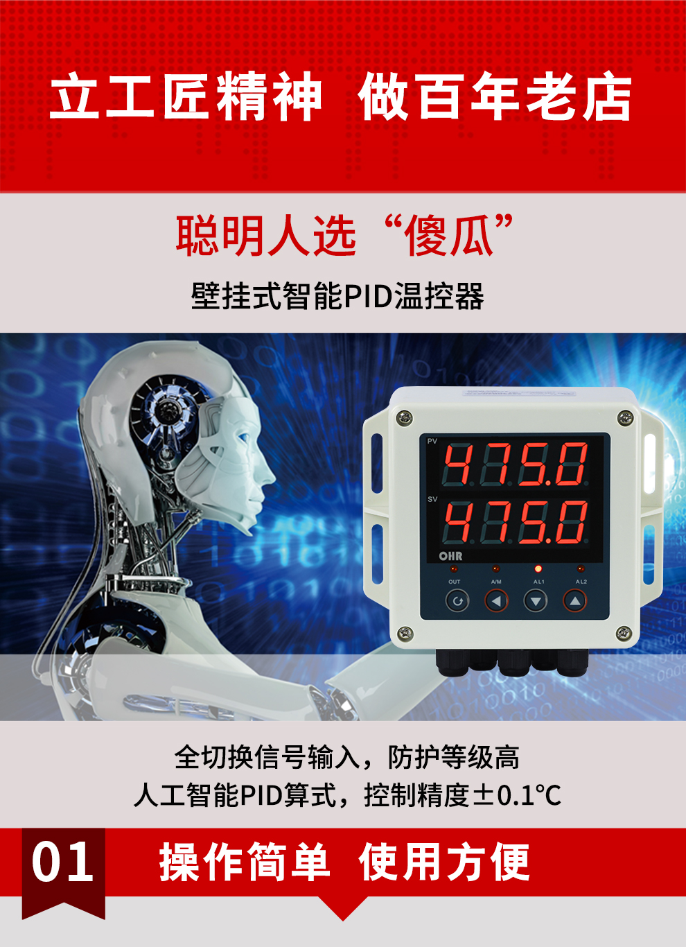虹潤公司是專業(yè)生產(chǎn)溫控器的國家專精特新“小巨人”企業(yè)。生產(chǎn)的壁掛式PID溫控器,具有全切換信號輸入,真正人工智能算式,控制精度達(dá)士0.1°C,防護(hù)等級高,RS485通訊輸出DN等特點。產(chǎn)品獲得模糊PID控制儀及控制方法、人工智能調(diào)節(jié)器、智能化控制器、移相觸發(fā)控制器、閥門自動手動無擾動操作控制方法及裝置等5項國家發(fā)明專利,主持起草主持起草工業(yè)過程控制系統(tǒng)用模擬輸入兩位或多位輸出儀表、物聯(lián)網(wǎng)智能溫度儀表通用技術(shù)條件、工業(yè)過程測量和控制系統(tǒng)用智能調(diào)節(jié)器等3項國家標(biāo)準(zhǔn),以及通信系統(tǒng)多通道數(shù)據(jù)采集控制終端規(guī)范軍用標(biāo)準(zhǔn)。參與國際5G標(biāo)準(zhǔn)制定,取得傻瓜式PID調(diào)節(jié)儀等3項相關(guān)軟件著作權(quán)。產(chǎn)品廣泛應(yīng)用于電力、石化,冶金、制藥、食品等幾乎所有工業(yè)現(xiàn)場,實現(xiàn)精準(zhǔn)控溫,保障生產(chǎn)安全與質(zhì)量。