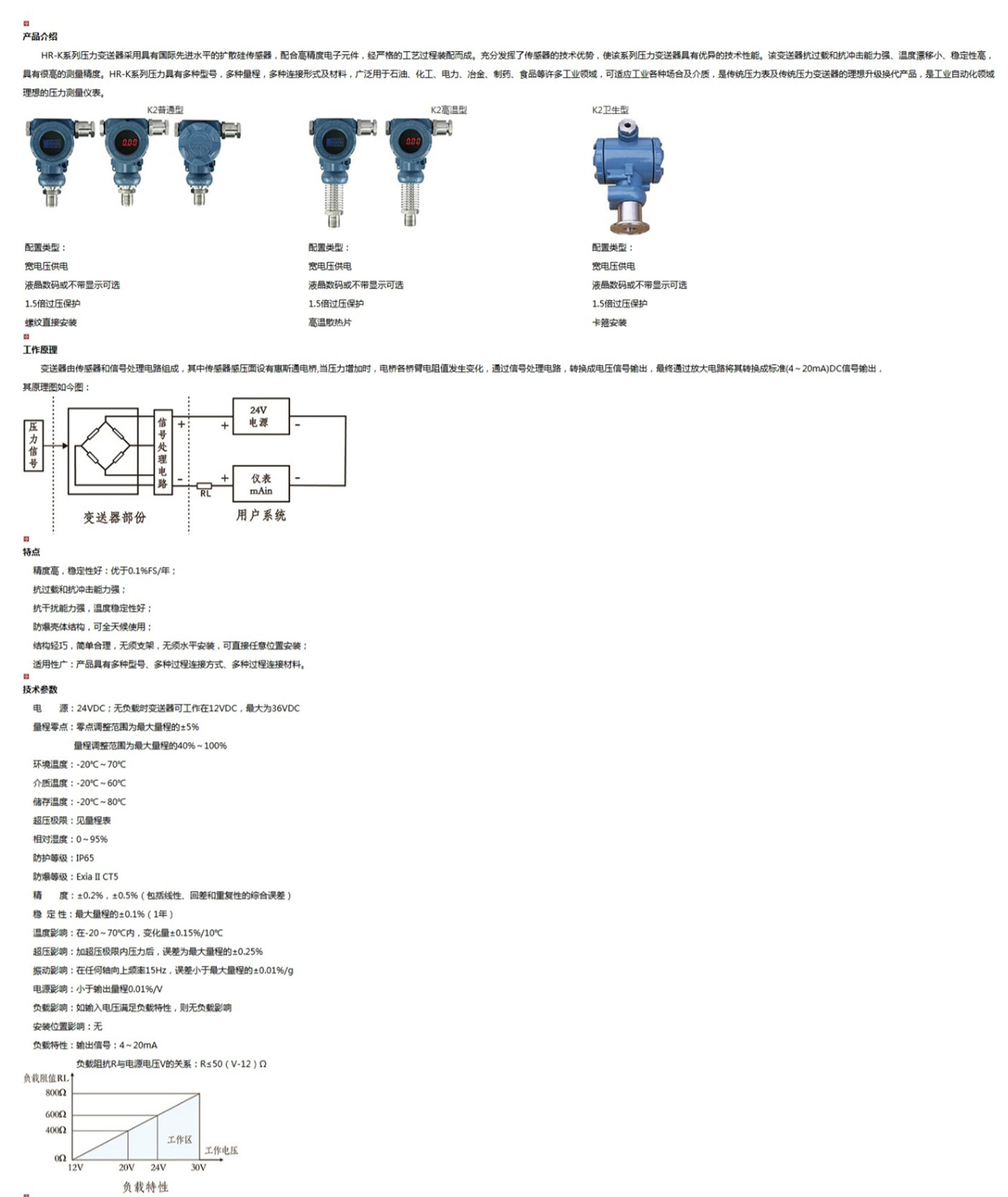 HR-K系列壓力變送器采用具有國際先進水平的擴散硅傳感器,配合高精度電子元件,經(jīng)嚴格的工藝過程裝配而成。充分發(fā)揮了傳感器的技術(shù)優(yōu)勢,使該系列壓力變送器具有優(yōu)異的技術(shù)性能。該變送器抗過載和抗沖擊能力強、溫度漂移小、穩(wěn)定性高,具有很高的測量精度。